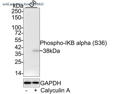 Western blot analysis of Phospho-IKB alpha (S36) on different lysates with Rabbit anti-Phospho-IKB alpha (S36) antibody (HA721802) at 1/1,000 dilution. Lane 1: C6 cell lysate Lane 2: C6 treated with 100n/mL Calyculin A for 1 hour cell lysate Lysates/proteins at 20 µg/Lane. Predicted band size: 36 kDa Observed band size: 38 kDa Exposure time: 2 minutes 45 seconds; 4-20% SDS-PAGE gel. Proteins were transferred to a PVDF membrane and blocked with 5% NFDM/TBST for 1 hour at room temperature. The primary antibody (HA721802) at 1/1,000 dilution was used in 5% NFDM/TBST at 4℃ overnight. Goat Anti-Rabbit IgG - HRP Secondary Antibody (HA1001) at 1/50,000 dilution was used for 1 hour at room temperature.