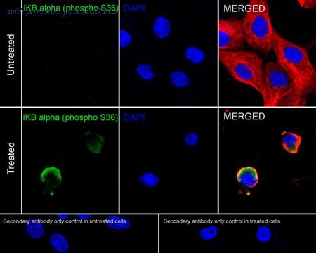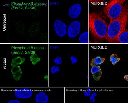 Immunocytochemistry analysis of HeLa cells labeling Phospho-IKB alpha (S32) with Rabbit anti-Phospho-IKB alpha (S32) antibody (ET1609-78) at 1/100 dilution. Cells were fixed in 4% paraformaldehyde for 20 minutes at room temperature, permeabilized with 0.1% Triton X-100 in PBS for 5 minutes at room temperature, then blocked with 1% BSA in 10% negative goat serum for 1 hour at room temperature. Cells were then incubated with Rabbit anti-Phospho-IKB alpha (S32) antibody (ET1609-78) at 1/100 dilution in 1% BSA in PBST overnight at 4 ℃. Goat Anti-Rabbit IgG H&L (iFluor™ 488, HA1121) was used as the secondary antibody at 1/1,000 dilution. PBS instead of the primary antibody was used as the secondary antibody only control. Nuclear DNA was labelled in blue with DAPI. Beta tubulin (M1305-2, red) was stained at 1/100 dilution overnight at +4℃. Goat Anti-Mouse IgG H&L (iFluor™ 594, HA1126) was used as the secondary antibody at 1/1,000 dilution.
