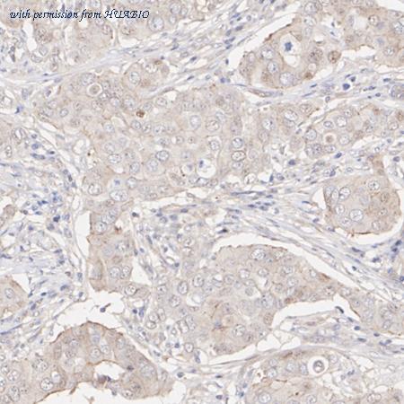 Immunohistochemical analysis of paraffin-embedded human breast cancer tissue with Rabbit anti-Phospho-IKB alpha (S32/S36) antibody (HA722770) at 1/200 dilution. The section was pre-treated using heat mediated antigen retrieval with sodium citrate buffer (pH 6.0) (high pressure) for 2 minutes. The tissues were blocked in 1% BSA for 20 minutes at room temperature, washed with ddH2O and PBS, and then probed with the primary antibody (HA722770) at 1/200 dilution for 1 hour at room temperature. The detection was performed using an HRP conjugated compact polymer system. DAB was used as the chromogen. Tissues were counterstained with hematoxylin and mounted with DPX.