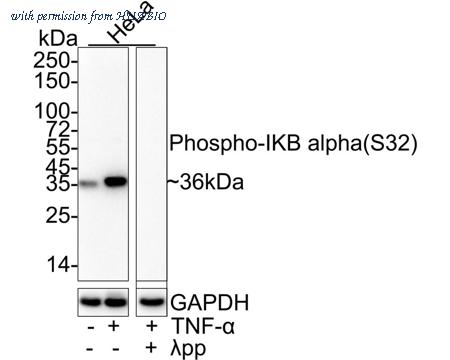Western blot analysis of Phospho-IKB alpha (S32) on different lysates with Rabbit anti-Phospho-IKB alpha (S32) antibody (HA750196) at 1/1,000 dilution. Lane 1: HeLa cell lysate Lane 2: HeLa treated with 20ng/mL TNF-α for 5 minutes cell lysate Lane 3: HeLa treated with 20ng/mL TNF-α for 5 minutes cell lysate, then the membrane treated with λpp for 1 hour Lysates/proteins at 20 µg/Lane. Predicted band size: 36 kDa Observed band size: 36 kDa Exposure time: 1 minute 2 seconds; 4-20% SDS-PAGE gel. Proteins were transferred to a PVDF membrane and blocked with 5% NFDM/TBST for 1 hour at room temperature. The primary antibody (HA750196) at 1/1,000 dilution was used in 5% NFDM/TBST at 4℃ overnight. Goat Anti-Rabbit IgG - HRP Secondary Antibody (HA1001) at 1/50,000 dilution was used for 1 hour at room temperature.