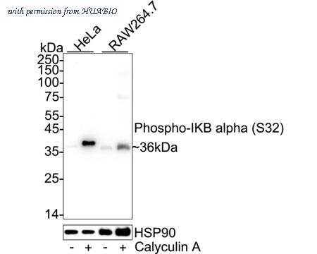 Western blot analysis of Phospho-IKB alpha (S32/S36) on different lysates with Rabbit anti-Phospho-IKB alpha (S32/S36) antibody (HA751119) at 1/5,000 dilution. Lane 1: HeLa cell lysate Lane 2: HeLa treated with 20ng/mL TNF-α and 100nM Calyculin A for 10 minutes cell lysate Lane 3: NIH/3T3 cell lysate Lane 4: NIH/3T3 treated with 20ng/mL TNF-α and 100nM Calyculin A for 10 minutes cell lysate Lane 5: C6 cell lysate Lane 6: C6 treated with 100ng/mL Calyculin A for 1 hours cell lysate Lysates/proteins at 20 µg/Lane. Predicted band size: 36 kDa Observed band size: 36 kDa Exposure time: 3 minutes; ECL: K1801; 4-20% SDS-PAGE gel. Proteins were transferred to a PVDF membrane and blocked with 5% NFDM/TBST for 1 hour at room temperature. The primary antibody (HA751119) at 1/5,000 dilution was used in 5% NFDM/TBST at 4℃ overnight. Goat Anti-Rabbit IgG - HRP Secondary Antibody (HA1001) at 1/50,000 dilution was used for 1 hour at room temperature.