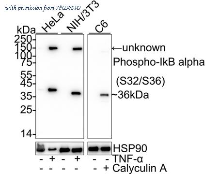 Western blot analysis of Phospho-IKB alpha (S32/S36) on different lysates with Rabbit anti-Phospho-IKB alpha (S32/S36) antibody (HA722770) at 1/5,000 dilution. Lane 1: HeLa cell lysate Lane 2: HeLa treated with 20ng/mL TNF-α and 100nM Calyculin A for 10 minutes cell lysate Lane 3: NIH/3T3 cell lysate Lane 4: NIH/3T3 treated with 20ng/mL TNF-α and 100nM Calyculin A for 10 minutes cell lysate Lane 5: C6 cell lysate Lane 6: C6 treated with 100ng/mL Calyculin A for 1 hours cell lysate Lysates/proteins at 20 µg/Lane. Predicted band size: 36 kDa Observed band size: 36 kDa Exposure time: 3 minutes; ECL: K1801; 4-20% SDS-PAGE gel. Proteins were transferred to a PVDF membrane and blocked with 5% NFDM/TBST for 1 hour at room temperature. The primary antibody (HA722770) at 1/5,000 dilution was used in 5% NFDM/TBST at 4℃ overnight. Goat Anti-Rabbit IgG - HRP Secondary Antibody (HA1001) at 1/50,000 dilution was used for 1 hour at room temperature.