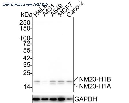 Western blot analysis of NM23 on different lysates with Mouse anti-NM23 antibody (EM1801-20) at 1/2,000 dilution. Lane 1: HeLa cell lysate (15 µg/Lane) Lane 2: A431 cell lysate (15 µg/Lane) Lane 3: A549 cell lysate (15 µg/Lane) Lane 4: MCF7 cell lysate (15 µg/Lane) Lane 5: Caco-2 cell lysate (15 µg/Lane) Predicted band size: 17 kDa Observed band size: 17/19 kDa Exposure time: 2 minutes; 4-20% SDS-PAGE gel. Proteins were transferred to a PVDF membrane and blocked with 5% NFDM/TBST for 1 hour at room temperature. The primary antibody (EM1801-20) at 1/2,000 dilution was used in 5% NFDM/TBST at 4℃ overnight. Goat Anti-Mouse IgG - HRP Secondary Antibody (HA1006) at 1:50,000 dilution was used for 1 hour at room temperature.