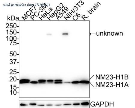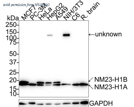 Western blot analysis of NM23 on different lysates with Mouse anti-NM23 antibody (HA610070) at 1/1,000 dilution. Lane 1: MCF7 cell lysate (20 µg/Lane) Lane 2: PC-3M cell lysate (20 µg/Lane) Lane 3: HeLa cell lysate (20 µg/Lane) Lane 4: HepG2 cell lysate (20 µg/Lane) Lane 5: A549 cell lysate (20 µg/Lane) Lane 4: NIH/3T3 cell lysate (20 µg/Lane) Lane 5: C6 cell lysate (20 µg/Lane) Lane 5: Rat brain tissue lysate (40 µg/Lane) Predicted band size: 17 kDa Observed band size: 17/19 kDa Exposure time: 1 minute; 4-20% SDS-PAGE gel. Proteins were transferred to a PVDF membrane and blocked with 5% NFDM/TBST for 1 hour at room temperature. The primary antibody (HA610070) at 1/1,000 dilution was used in 5% NFDM/TBST at 4℃ overnight. Goat Anti-Mouse IgG - HRP Secondary Antibody (HA1006) at 1:50,000 dilution was used for 1 hour at room temperature.