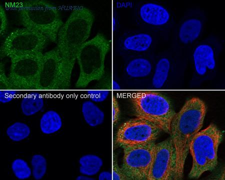 Immunocytochemistry analysis of HeLa cells labeling NM23 with Mouse anti-NM23 antibody (HA601307) at 1/100 dilution. Cells were fixed in 4% paraformaldehyde for 20 minutes at room temperature, permeabilized with 0.1% Triton X-100 in PBS for 5 minutes at room temperature, then blocked with 1% BSA in 10% negative goat serum for 1 hour at room temperature. Cells were then incubated with Mouse anti-NM23 antibody (HA601307) at 1/100 dilution in 1% BSA in PBST overnight at 4 ℃. Goat Anti-Mouse IgG H&L (iFluor™ 488, HA1125) was used as the secondary antibody at 1/1,000 dilution. PBS instead of the primary antibody was used as the secondary antibody only control. Nuclear DNA was labelled in blue with DAPI. beta Tubulin (ET1602-4, red) was stained at 1/100 dilution overnight at +4℃. Goat Anti-Rabbit IgG H&L (iFluor™ 594, HA1122) were used as the secondary antibody at 1/1,000 dilution.