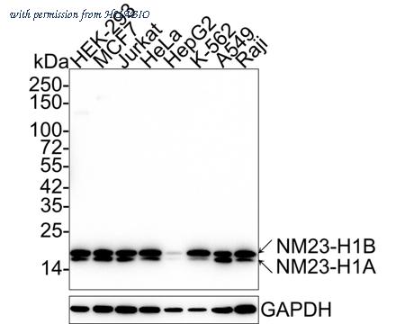 Western blot analysis of NM23 on different lysates with Mouse anti-NM23 antibody (HA610113) at 1/1,000 dilution. Lane 1: HEK-293 cell lysate (20 µg/Lane) Lane 2: MCF7 cell lysate (20 µg/Lane) Lane 3: Jurkat cell lysate (20 µg/Lane) Lane 4: HeLa cell lysate (20 µg/Lane) Lane 5: HepG2 cell lysate (20 µg/Lane) Lane 6: K-562 cell lysate (20 µg/Lane) Lane 7: A549 cell lysate (20 µg/Lane) Lane 8: Raji cell lysate (20 µg/Lane) Predicted band size: 17 kDa Observed band size: 17/20 kDa Exposure time: 3 minutes; ECL: K1801; 4-20% SDS-PAGE gel. Proteins were transferred to a PVDF membrane and blocked with 5% NFDM/TBST for 1 hour at room temperature. The primary antibody (HA610113) at 1/1,000 dilution was used in 5% NFDM/TBST at 4℃ overnight. Goat Anti-Mouse IgG - HRP Secondary Antibody (HA1006) at 1/50,000 dilution was used for 1 hour at room temperature.