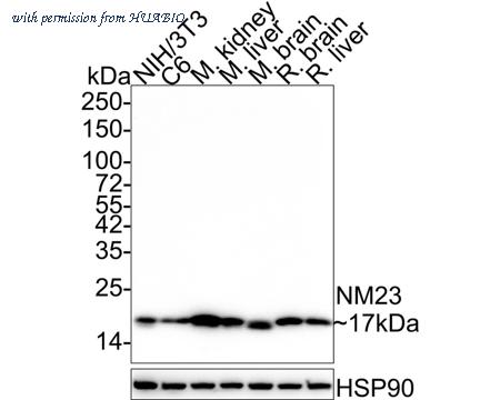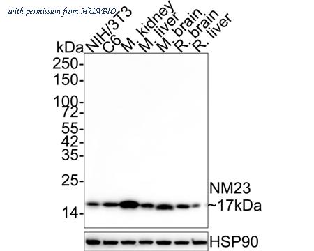 Western blot analysis of NM23 on different lysates with Mouse anti-NM23 antibody (HA601190) at 1/1,000 dilution. Lane 1: MCF7 cell lysate (20 µg/Lane) Lane 2: PC-3M cell lysate (20 µg/Lane) Lane 3: HeLa cell lysate (20 µg/Lane) Lane 4: HepG2 cell lysate (20 µg/Lane) Lane 5: A549 cell lysate (20 µg/Lane) Lane 4: NIH/3T3 cell lysate (20 µg/Lane) Lane 5: C6 cell lysate (20 µg/Lane) Lane 5: Rat brain tissue lysate (40 µg/Lane) Predicted band size: 17 kDa Observed band size: 17/19 kDa Exposure time: 1 minute; 4-20% SDS-PAGE gel. Proteins were transferred to a PVDF membrane and blocked with 5% NFDM/TBST for 1 hour at room temperature. The primary antibody (HA601190) at 1/1,000 dilution was used in 5% NFDM/TBST at 4℃ overnight. Goat Anti-Mouse IgG - HRP Secondary Antibody (HA1006) at 1:50,000 dilution was used for 1 hour at room temperature.