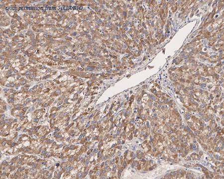 Immunohistochemical analysis of paraffin-embedded human liver cancer tissue with Mouse anti-NM23 antibody (EM1901-09) at 1/200 dilution. The section was pre-treated using heat mediated antigen retrieval with sodium citrate buffer (pH 6.0) (high pressure) for 2 minutes. The tissues were blocked in 1% BSA for 20 minutes at room temperature, washed with ddH2O and PBS, and then probed with the primary antibody (EM1901-09) at 1/200 dilution for 1 hour at room temperature. The detection was performed using an HRP conjugated compact polymer system. DAB was used as the chromogen. Tissues were counterstained with hematoxylin and mounted with DPX.