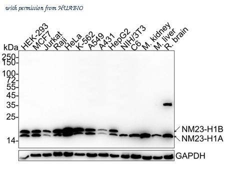 Western blot analysis of NM23 on different lysates with Mouse anti-NM23 antibody (HA601307) at 1/2,000 dilution. Lane 1: HEK-293 cell lysate (20 µg/Lane) Lane 2: MCF7 cell lysate (20 µg/Lane) Lane 3: Jurkat cell lysate (20 µg/Lane) Lane 4: Raji cell lysate (20 µg/Lane) Lane 5: HeLa cell lysate (20 µg/Lane) Lane 6: K-562 cell lysate (20 µg/Lane) Lane 7: A549 cell lysate (20 µg/Lane) Lane 8: A431 cell lysate (20 µg/Lane) Lane 9: HepG2 cell lysate (20 µg/Lane) Lane 10: NIH/3T3 cell lysate (20 µg/Lane) Lane 11: C6 cell lysate (20 µg/Lane) Lane 12: Mouse kidney tissue lysate (40 µg/Lane) Lane 13: Mouse liver tissue lysate (40 µg/Lane) Lane 14: Rat brain tissue lysate (40 µg/Lane) Predicted band size: 17 kDa Observed band size: 17/20 kDa Exposure time: 1 minute 59 seconds; 4-20% SDS-PAGE gel. Proteins were transferred to a PVDF membrane and blocked with 5% NFDM/TBST for 1 hour at room temperature. The primary antibody (HA601307) at 1/2,000 dilution was used in 5% NFDM/TBST at 4℃ overnight. Goat Anti-Mouse IgG - HRP Secondary Antibody (HA1006) at 1/50,000 dilution was used for 1 hour at room temperature.