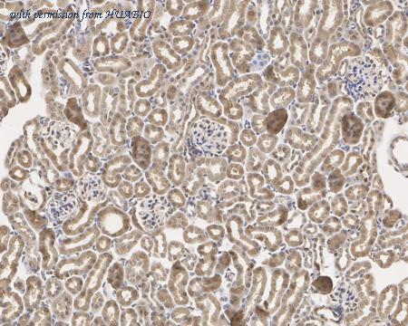 Immunohistochemical analysis of paraffin-embedded mouse kidney tissue with Mouse anti-NM23 antibody (HA610180) at 1/2,000 dilution. The section was pre-treated using heat mediated antigen retrieval with Tris-EDTA buffer (pH 9.0) for 20 minutes. The tissues were blocked in 1% BSA for 20 minutes at room temperature, washed with ddH2O and PBS, and then probed with the primary antibody (HA610180) at 1/2,000 dilution for 1 hour at room temperature. The detection was performed using an HRP conjugated compact polymer system. DAB was used as the chromogen. Tissues were counterstained with hematoxylin and mounted with DPX.