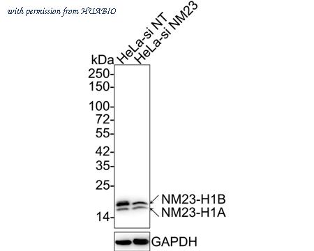 Western blot analysis of NM23 on different lysates with Mouse anti-NM23 antibody (HA601190) at 1/2,000 dilution. Lane 1: HeLa-si NT cell lysate Lane 2: HeLa-si NM23 cell lysate Lysates/proteins at 15 µg/Lane. Predicted band size: 17 kDa Observed band size: 17/19 kDa Exposure time: 46 seconds; 4-20% SDS-PAGE gel. Proteins were transferred to a PVDF membrane and blocked with 5% NFDM/TBST for 1 hour at room temperature. The primary antibody (HA601190) at 1/2,000 dilution was used in 5% NFDM/TBST at 4℃ overnight. Goat Anti-Mouse IgG - HRP Secondary Antibody (HA1006) at 1/50,000 dilution was used for 1 hour at room temperature.