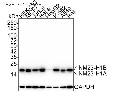 Western blot analysis of NM23 on different lysates with Mouse anti-NM23 antibody (EM1901-09) at 1/2,000 dilution. Lane 1: HEK-293 cell lysate (20 µg/Lane) Lane 2: MCF7 cell lysate (20 µg/Lane) Lane 3: Jurkat cell lysate (20 µg/Lane) Lane 4: HeLa cell lysate (20 µg/Lane) Lane 5: HepG2 cell lysate (20 µg/Lane) Lane 6: K-562 cell lysate (20 µg/Lane) Lane 7: A549 cell lysate (20 µg/Lane) Lane 8: Raji cell lysate (20 µg/Lane) Predicted band size: 17 kDa Observed band size: 17/20 kDa Exposure time: 3 minutes; ECL: K1801; 4-20% SDS-PAGE gel. Proteins were transferred to a PVDF membrane and blocked with 5% NFDM/TBST for 1 hour at room temperature. The primary antibody (EM1901-09) at 1/2,000 dilution was used in 5% NFDM/TBST at 4℃ overnight. Goat Anti-Mouse IgG - HRP Secondary Antibody (HA1006) at 1/50,000 dilution was used for 1 hour at room temperature.