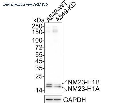 Western blot analysis of NM23 on different lysates with Mouse anti-NM23 antibody (HA610113) at 1/2,000 dilution. Lane 1: A549-si NT cell lysate Lane 2: A549-si NM23 cell lysate Lysates/proteins at 10 µg/Lane. Predicted band size: 17 kDa Observed band size: 17/20 kDa Exposure time: 30 seconds; ECL: K1801; 4-20% SDS-PAGE gel. Proteins were transferred to a PVDF membrane and blocked with 5% NFDM/TBST for 1 hour at room temperature. The primary antibody (HA610113) at 1/2,000 dilution was used in 5% NFDM/TBST at room temperature for 2 hours. Goat Anti-Mouse IgG - HRP Secondary Antibody (HA1006) at 1/50,000 dilution was used for 1 hour at room temperature.