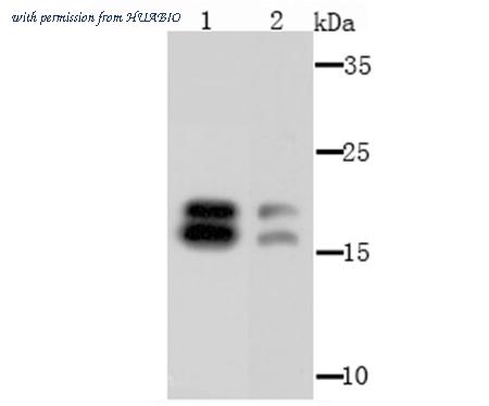 Western blot analysis of NM23 on different lysates with Mouse anti-NM23 antibody (HA610070) at 1/2,000 dilution. Lane 1: HeLa-si NT cell lysate Lane 2: HeLa-si NM23 cell lysate Lysates/proteins at 15 µg/Lane. Predicted band size: 17 kDa Observed band size: 17/19 kDa Exposure time: 46 seconds; 4-20% SDS-PAGE gel. Proteins were transferred to a PVDF membrane and blocked with 5% NFDM/TBST for 1 hour at room temperature. The primary antibody (HA610070) at 1/2,000 dilution was used in 5% NFDM/TBST at 4℃ overnight. Goat Anti-Mouse IgG - HRP Secondary Antibody (HA1006) at 1/50,000 dilution was used for 1 hour at room temperature.