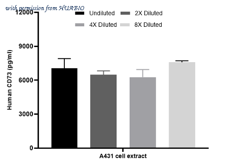 Interpolated concentrations of native CD73 in A431 extract samples based on a 1,000 µg/ml extract load. The concentrations of CD73 were measured in duplicates, interpolated from the CD73 standard curve and corrected for sample dilution. Undiluted samples are A431 extract 25%. The interpolated dilution factor corrected values are plotted (mean +/- SD, n=2). The mean CD73 concentration was determined to be 6,201 pg/ml in A431 extract.