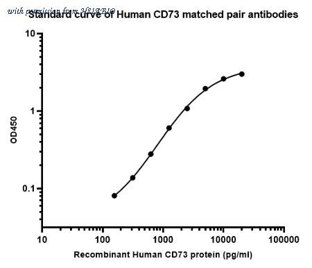 Sandwich ELISA analysis of human CD73 matched pair antibodies Elisa assay was performed by coating wells of a 96-well plate with 50 µl per well of capture antibody (HA722957) diluted in carbonate/bicarbonate buffer, at a concentration of 5 µg/mL overnight at 4℃. Wells of the plate were washed, blocked with 150 µl 0.05% tween-20 1%BSA blocking buffer, and incubated with serial diluted recombinant Human CD73 protein (HA210915) starting from 20,000 pg/ml to 0 pg/ml and detect antibody (HA722957, Biotin, 0.2 µg/ml) for 1 hour at 30℃ with shaking. Then the plate was washed and incubated with 50 µl per well of SA-HRP for 0.5 hour at 30℃ with shaking. Detection was performed using an Ultra TMB Substrate for 10 minutes at room temperature in the dark. The reaction was stopped with sulfuric acid and absorbances were read on a spectrophotometer at 450 nm.