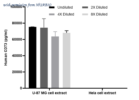 Interpolated concentrations of native CD73 in U-87 MG and Hela extract samples based on a 1,000 µg/ml extract load. The concentrations of CD73 were measured in duplicates, interpolated from the CD73 standard curve and corrected for sample dilution. Undiluted samples are U-87 MG extract 13% and Hela extract 100%. The interpolated dilution factor corrected values are plotted (mean +/- SD, n=2). The mean CD73 concentration was determined to be 70,356 pg/ml in U-87 MG extract and undetectable in Hela extract.