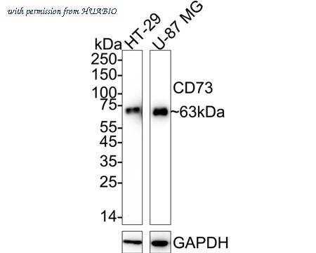 Western blot analysis of CD73 on different lysates with Rabbit anti-CD73 antibody (HA751304) at 1/2,000 dilution. Lane 1: HT-29 cell lysate Lane 2: U-87 MG cell lysate Lysates/proteins at 15 µg/Lane. Predicted band size: 63 kDa Observed band size: 63 kDa Exposure time: Lane 1: 3 minutes; Lane 2: 20 seconds; ECL: K1801; 4-20% SDS-PAGE gel. Proteins were transferred to a PVDF membrane and blocked with 5% NFDM/TBST for 1 hour at room temperature. The primary antibody (HA751304) at 1/2,000 dilution was used in 5% NFDM/TBST at 4℃ overnight. Goat Anti-Rabbit IgG - HRP Secondary Antibody (HA1001) at 1/50,000 dilution was used for 1 hour at room temperature.
