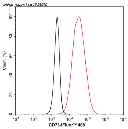 Flow cytometric analysis of HT-29 cells labeling CD73. Cells were washed twice with cold PBS and resuspend. Then stained with the primary antibody (HA751304, 1/5,000) (red) compared with Rabbit IgG Isotype Control (green). After incubation of the primary antibody at +4℃ for an hour, the cells were stained with a iFluor™ 488 conjugate-Goat anti-Rabbit IgG Secondary antibody (HA1121) at 1/5,000 dilution for 30 minutes at +4℃. Unlabelled sample was used as a control (cells without incubation with primary antibody; black).