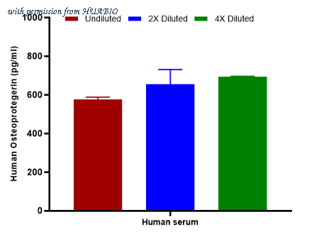 Interpolated concentrations of native Osteoprotegerin in human serum samples. Capture: HA725067, Human Osteoprotegerin Rabbit mAb [PSH13-31] Detector: HA725068, Human Osteoprotegerin Rabbit mAb [PSH13-32] The concentrations of Osteoprotegerin were measured in duplicates, interpolated from the Osteoprotegerin standard curve and corrected for sample dilution. Undiluted samples are human serum 100%. The interpolated dilution factor corrected values are plotted (mean +/- SD, n=2). The mean Osteoprotegerin concentration was determined to be 641 pg/ml in human serum.