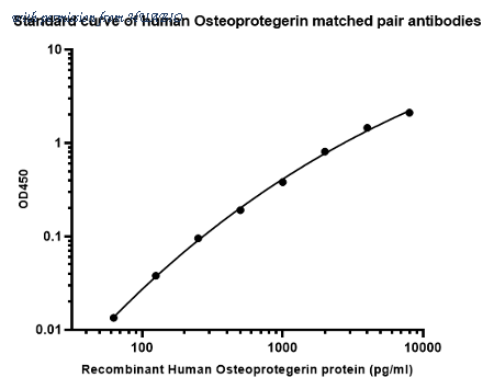 Sandwich ELISA analysis of Human Osteoprotegerin matched pair antibodies Capture: HA725067, Human Osteoprotegerin Rabbit mAb [PSH13-31] Detector: HA725068, Human Osteoprotegerin Rabbit mAb [PSH13-32] Elisa assay was performed by coating wells of a 96-well plate with 50 µl per well of capture antibody (HA725067) diluted in carbonate/bicarbonate buffer, at a concentration of 5 µg/ml overnight at 4℃. Wells of the plate were washed, blocked with 150 µl 0.05% tween-20 1% BSA blocking buffer, and incubated with serial diluted Recombinant Human Osteoprotegerin protein (HA210977) starting from 8,000 pg/ml to 0 pg/ml and detect antibody (HA725068, Biotin, 0.2 µg/ml) for 1 hour at 30℃ with shaking. Then the plate was washed and incubated with 50 µl per well of SA-HRP for 0.5 hour at 30℃ with shaking. Detection was performed using an Ultra TMB Substrate for 10 minutes at room temperature in the dark. The reaction was stopped with sulfuric acid and absorbances were read on a spectrophotometer at 450 nm.