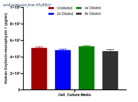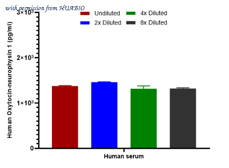 Interpolated concentrations of native Oxytocin-neurophysin 1 in human serum samples. Capture: HA723452, Human Oxytocin-neurophysin 1 Rabbit mAb [PSH12-28] Detector: HA723453, Human Oxytocin-neurophysin 1 Rabbit mAb [PSH12-29] Interpolated concentration of native Oxytocin-neurophysin 1 was measured in duplicate at different sample concentrations. The interpolated dilution factor corrected values were plotted (mean +/- SD, n=2). The mean Oxytocin-neurophysin 1 concentration was determined to be 1368 pg/mL in Human serum.
