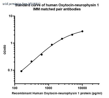 Sandwich ELISA analysis of human Oxytocin-neurophysin 1 matched pair antibodies Capture: HA723452, Human Oxytocin-neurophysin 1 Rabbit mAb [PSH12-28] Detector: HA723453, Human Oxytocin-neurophysin 1 Rabbit mAb [PSH12-29] Elisa assay was performed by coating wells of a 96-well plate with 100 µl per well of capture antibody (HA723452) diluted in carbonate/bicarbonate buffer, at a concentration of 5 µg/mL overnight at 4℃. Wells of the plate were washed, blocked with 150 µl 0.05% tween-20 1% BSA blocking buffer, and incubated with serial diluted Recombinant Human Oxytocin-neurophysin 1 protein (HA211134) starting from 10,000 pg/ml to 0 pg/ml and detect antibody (HA723453, Biotin, 0.2 µg/ml) for 1 hour at 30℃ with shaking. Then the plate was washed and incubated with 100 µl per well of SA-HRP for 0.5 hour at 30℃ with shaking. Detection was performed using an Ultra TMB Substrate for 10 minutes at room temperature in the dark. The reaction was stopped with sulfuric acid and absorbances were read on a spectrophotometer at 450 nm.