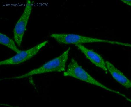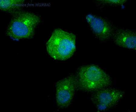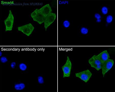 Immunocytochemistry analysis of PANC-1 cells labeling Smad4 with Rabbit anti-Smad4 antibody (HA721234) at 1/50 dilution. Cells were fixed in 4% paraformaldehyde for 10 minutes at 37 ℃, permeabilized with 0.05% Triton X-100 in PBS for 20 minutes, and then blocked with 2% negative goat serum for 30 minutes at room temperature. Cells were then incubated with Rabbit anti-Smad4 antibody (HA721234) at 1/50 dilution in 2% negative goat serum overnight at 4 ℃. Goat Anti-Rabbit IgG H&L (iFluor™ 488, HA1121) was used as the secondary antibody at 1/1,000 dilution. PBS instead of the primary antibody was used as the secondary antibody only control. Nuclear DNA was labelled in blue with DAPI.