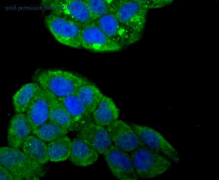 ICC staining Smad4 in A549 cells (green). The nuclear counter stain is DAPI (blue). Cells were fixed in paraformaldehyde, permeabilised with 0.25% Triton X100/PBS.