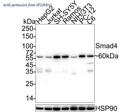 Western blot analysis of Smad4 on different lysates with Rabbit anti-Smad4 antibody (HA721234) at 1/1,000 dilution. Lane 1: HepG2 cell lysate Lane 2: Jurkat cell lysate Lane 3: SH-SY5Y cell lysate Lane 4: Ramos cell lysate Lane 5: NIH/3T3 cell lysate Lane 6: PC-12 cell lysate Lane 7: C6 cell lysate Lysates/proteins at 20 µg/Lane. Predicted band size: 60 kDa Observed band size: 60 kDa Exposure time: 25 seconds; 4-20% SDS-PAGE gel. Proteins were transferred to a PVDF membrane and blocked with 5% NFDM/TBST for 1 hour at room temperature. The primary antibody (HA721234) at 1/1,000 dilution was used in 5% NFDM/TBST at 4℃ overnight. Goat Anti-Rabbit IgG - HRP Secondary Antibody (HA1001) at 1/50,000 dilution was used for 1 hour at room temperature.