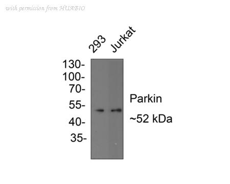 Western blot analysis of Parkin on different lysates with Rabbit anti-Parkin antibody (HA750354) at 1/1,000 dilution. Lane 1: 293 cell lysate Lane 2: Jurkat cell lysate Lysates/proteins at 10 µg/Lane. Predicted band size: 52 kDa Observed band size: 52 kDa Exposure time: 1 minutes; 10% SDS-PAGE gel. Proteins were transferred to a PVDF membrane and blocked with 5% NFDM/TBST for 1 hour at room temperature. The primary antibody (HA750354) at 1/1,000 dilution was used in 5% NFDM/TBST at room temperature for 2 hours. Goat Anti-Rabbit IgG - HRP Secondary Antibody (HA1001) at 1:300,000 dilution was used for 1 hour at room temperature.