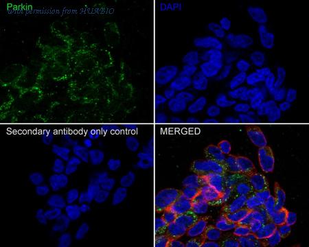 Immunocytochemistry analysis of SH-SY5Y cells labeling Parkin with Rabbit anti-Parkin antibody (HA750354) at 1/100 dilution. Cells were fixed in 4% paraformaldehyde for 10 minutes at 37 ℃, permeabilized with 0.05% Triton X-100 in PBS for 20 minutes, and then blocked with 2% negative goat serum for 30 minutes at room temperature. Cells were then incubated with Rabbit anti-Parkin antibody (HA750354) at 1/100 dilution in 2% negative goat serum overnight at 4 ℃. Goat Anti-Rabbit IgG H&L (iFluor™ 488, HA1121) was used as the secondary antibody at 1/1,000 dilution. Nuclear DNA was labelled in blue with DAPI. Beta tubulin (M1305-2, red) was stained at 1/200 dilution overnight at +4℃. Goat Anti-Mouse IgG H&L (iFluor™ 594, HA1126) was used as the secondary antibody at 1/1,000 dilution.