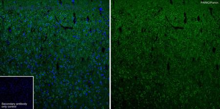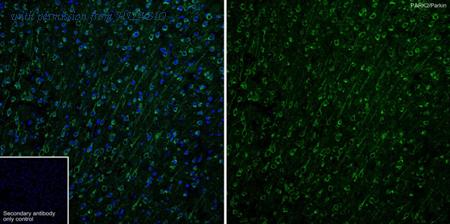 Immunohistochemical analysis of paraffin-embedded mouse brain tissue with Rabbit anti-Parkin antibody (HA722952) at 1/1,000 dilution. The section was pre-treated using heat mediated antigen retrieval with Tris-EDTA buffer (pH 9.0) for 20 minutes. The tissues were blocked in 1% BSA for 20 minutes at room temperature, washed with ddH2O and PBS, and then probed with the primary antibody (HA722952) at 1/1,000 dilution for 1 hour at room temperature. The detection was performed using an HRP conjugated compact polymer system. DAB was used as the chromogen. Tissues were counterstained with hematoxylin and mounted with DPX.