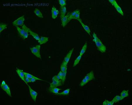 ICC staining of Claudin 18.2 in MG-63 cells (green). Formalin fixed cells were permeabilized with 0.1% Triton X-100 in TBS for 10 minutes at room temperature and blocked with 10% negative goat serum for 15 minutes at room temperature. Cells were probed with the primary antibody (ER1902-86, 1/50) for 1 hour at room temperature, washed with PBS. Alexa Fluor®488 conjugate-Goat anti-Rabbit IgG was used as the secondary antibody at 1/1,000 dilution. The nuclear counter stain is DAPI (blue).