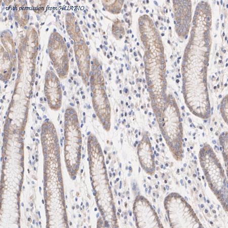 Immunohistochemical analysis of paraffin-embedded rat stomach tissue with Rabbit anti-Claudin 18.2 antibody (HA751419) at 1/2,000 dilution. The section was pre-treated using heat mediated antigen retrieval with Tris-EDTA buffer (pH 9.0) for 20 minutes. The tissues were blocked in 1% BSA for 20 minutes at room temperature, washed with ddH2O and PBS, and then probed with the primary antibody (HA751419) at 1/2,000 dilution for 1 hour at room temperature. The detection was performed using an HRP conjugated compact polymer system. DAB was used as the chromogen. Tissues were counterstained with hematoxylin and mounted with DPX.