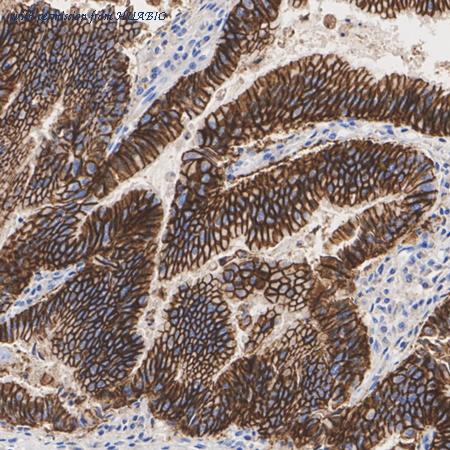 Immunohistochemical analysis of paraffin-embedded human stomach cancer tissue with Mouse anti-Claudin 18.2 antibody (HA601432) at 1/50 dilution. The section was pre-treated using heat mediated antigen retrieval with Tris-EDTA buffer (pH 9.0) for 20 minutes. The tissues were blocked in 1% BSA for 20 minutes at room temperature, washed with ddH2O and PBS, and then probed with the primary antibody (HA601432) at 1/50 dilution for 1 hour at room temperature. The detection was performed using an HRP conjugated compact polymer system. DAB was used as the chromogen. Tissues were counterstained with hematoxylin and mounted with DPX.