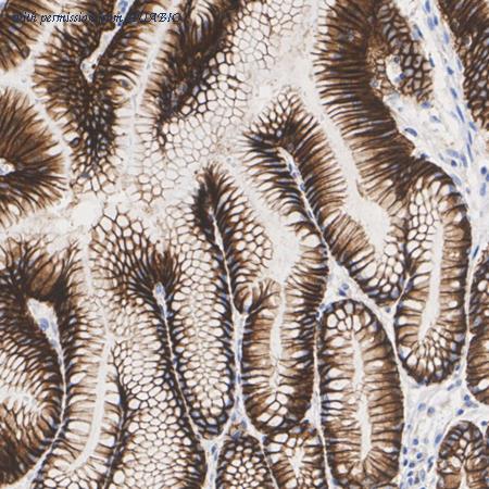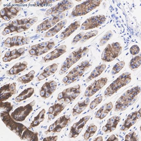 Immunohistochemical analysis of paraffin-embedded human stomach tissue with Rabbit anti-Claudin 18.2 antibody (ER1902-86) at 1/8,000 dilution. The section was pre-treated using heat mediated antigen retrieval with Tris-EDTA buffer (pH 9.0) for 20 minutes. The tissues were blocked in 1% BSA for 20 minutes at room temperature, washed with ddH2O and PBS, and then probed with the primary antibody (ER1902-86) at 1/8,000 dilution for 1 hour at room temperature. The detection was performed using an HRP conjugated compact polymer system. DAB was used as the chromogen. Tissues were counterstained with hematoxylin and mounted with DPX.