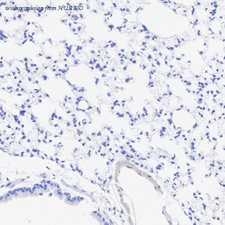 Immunohistochemical analysis of paraffin-embedded mouse lung tissue (negative) with Rabbit anti-Claudin 18.2 antibody (HA751419) at 1/2,000 dilution. The section was pre-treated using heat mediated antigen retrieval with Tris-EDTA buffer (pH 9.0) for 20 minutes. The tissues were blocked in 1% BSA for 20 minutes at room temperature, washed with ddH2O and PBS, and then probed with the primary antibody (HA751419) at 1/2,000 dilution for 1 hour at room temperature. The detection was performed using an HRP conjugated compact polymer system. DAB was used as the chromogen. Tissues were counterstained with hematoxylin and mounted with DPX.