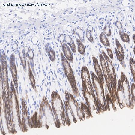 Immunohistochemical analysis of paraffin-embedded mouse stomach tissue with Rabbit anti-Claudin 18.2 antibody (HA751419) at 1/2,000 dilution. The section was pre-treated using heat mediated antigen retrieval with Tris-EDTA buffer (pH 9.0) for 20 minutes. The tissues were blocked in 1% BSA for 20 minutes at room temperature, washed with ddH2O and PBS, and then probed with the primary antibody (HA751419) at 1/2,000 dilution for 1 hour at room temperature. The detection was performed using an HRP conjugated compact polymer system. DAB was used as the chromogen. Tissues were counterstained with hematoxylin and mounted with DPX.
