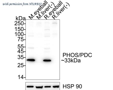 Western blot analysis of PHOS / PDC on different lysates with Rabbit anti-PHOS / PDC antibody (HA751300) at 1/5,000 dilution. Lane 1: mouse eyeball tissue lysate (40 µg/Lane) Lane 2: mouse liver tissue lysate (negative) (40 µg/Lane) Lane 3: rat eyeball tissue lysate (40 µg/Lane) Lane 4: rat liver tissue lysate (negative) (40 µg/Lane) Predicted band size: 28 kDa Observed band size: 33 kDa Exposure time: 10 seconds; ECL: K1801; 4-20% SDS-PAGE gel. Proteins were transferred to a PVDF membrane and blocked with 5% NFDM/TBST for 1 hour at room temperature. The primary antibody (HA751300) at 1/5,000 dilution was used in 5% NFDM/TBST at 4℃ overnight. Goat Anti-Rabbit IgG - HRP Secondary Antibody (HA1001) at 1/50,000 dilution was used for 1 hour at room temperature.
