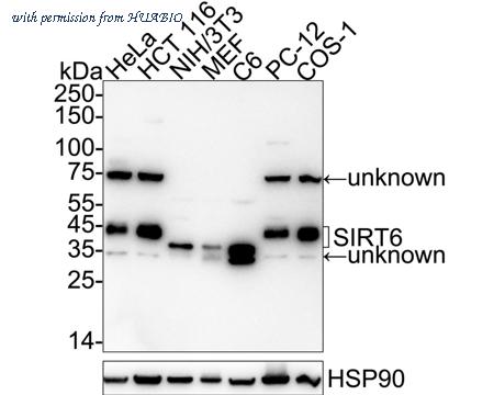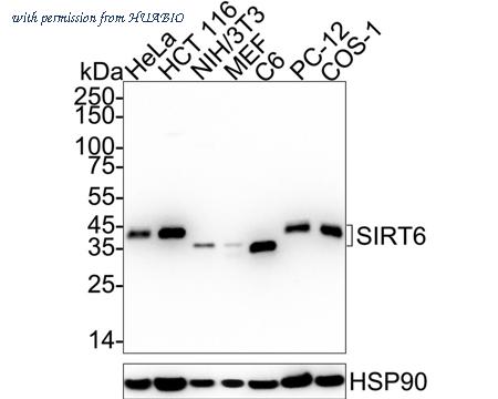 Western blot analysis of SIRT6 on different lysates with Rabbit anti-SIRT6 antibody (HA751389) at 1/2,000 dilution. Lane 1: HeLa cell lysate (20 µg/Lane) Lane 2: HCT 116 cell lysate (20 µg/Lane) Lane 3: NIH/3T3 cell lysate (20 µg/Lane) Lane 4: MEF cell lysate (20 µg/Lane) Lane 5: C6 cell lysate (20 µg/Lane) Lane 6: PC-12 cell lysate (20 µg/Lane) Lane 7: COS-1 cell lysate (20 µg/Lane) Predicted band size: 39 kDa Observed band size: 36/42 kDa Exposure time: 46 seconds; ECL: K1801; 4-20% SDS-PAGE gel. Proteins were transferred to a PVDF membrane and blocked with 5% NFDM/TBST for 1 hour at room temperature. The primary antibody (HA751389) at 1/2,000 dilution was used in 5% NFDM/TBST at 4℃ overnight. Goat Anti-Rabbit IgG - HRP Secondary Antibody (HA1001) at 1/50,000 dilution was used for 1 hour at room temperature.