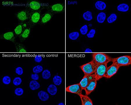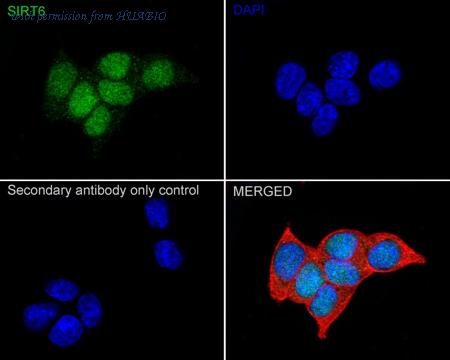Immunocytochemistry analysis of HCT 116 cells labeling SIRT6 with Rabbit anti-SIRT6 antibody (HA751388) at 1/100 dilution. Cells were fixed in 4% paraformaldehyde for 15 minutes at room temperature, permeabilized with 0.1% Triton X-100 in PBS for 15 minutes at room temperature, then blocked with 1% BSA in 10% negative goat serum for 1 hour at room temperature. Cells were then incubated with Rabbit anti-SIRT6 antibody (HA751388) at 1/100 dilution in 1% BSA in PBST overnight at 4 ℃. Goat Anti-Rabbit IgG H&L (iFluor™ 488, HA1121) was used as the secondary antibody at 1/1,000 dilution. PBS instead of the primary antibody was used as the secondary antibody only control. Nuclear DNA was labelled in blue with DAPI. Beta tubulin (HA601187, red) was stained at 1/100 dilution overnight at +4℃. Goat Anti-Mouse IgG H&L (iFluor™ 594, HA1126) was used as the secondary antibody at 1/1,000 dilution.
