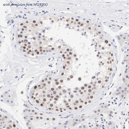 Immunohistochemical analysis of paraffin-embedded human testis tissue with Rabbit anti-SIRT6 antibody (HA723265) at 1/1,000 dilution. The section was pre-treated using heat mediated antigen retrieval with Tris-EDTA buffer (pH 9.0) for 20 minutes. The tissues were blocked in 1% BSA for 20 minutes at room temperature, washed with ddH2O and PBS, and then probed with the primary antibody (HA723265) at 1/1,000 dilution for 1 hour at room temperature. The detection was performed using an HRP conjugated compact polymer system. DAB was used as the chromogen. Tissues were counterstained with hematoxylin and mounted with DPX.