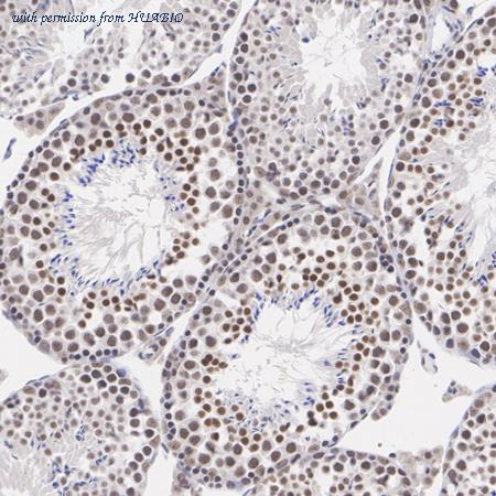 Immunohistochemical analysis of paraffin-embedded mouse testis tissue with Rabbit anti-SIRT6 antibody (HA751389) at 1/1,000 dilution. The section was pre-treated using heat mediated antigen retrieval with Tris-EDTA buffer (pH 9.0) for 20 minutes. The tissues were blocked in 1% BSA for 20 minutes at room temperature, washed with ddH2O and PBS, and then probed with the primary antibody (HA751389) at 1/1,000 dilution for 1 hour at room temperature. The detection was performed using an HRP conjugated compact polymer system. DAB was used as the chromogen. Tissues were counterstained with hematoxylin and mounted with DPX.