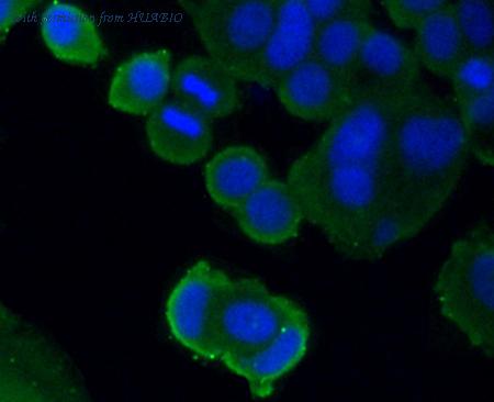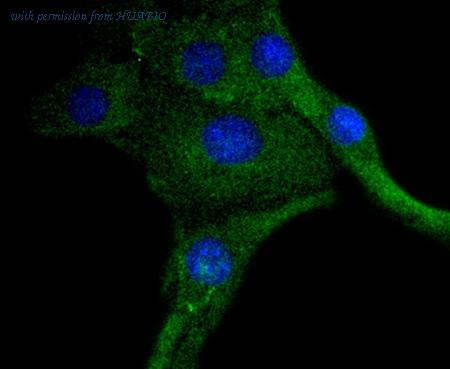 ICC staining PDGF Receptor beta in MCF-7 cells (green). The nuclear counter stain is DAPI (blue). Cells were fixed in paraformaldehyde, permeabilised with 0.25% Triton X100/PBS.