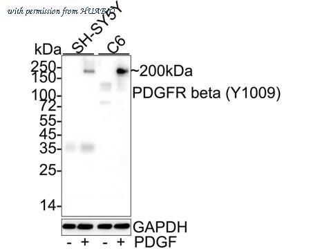 Western blot analysis of Phospho-PDGFR beta (Y1009) on different lysates with Rabbit anti-Phospho-PDGFR beta (Y1009) antibody (HA721736) at 1/1,000 dilution. Lane 1: SH-SY5Y cell lysate Lane 2: SH-SY5Y treated with 100ng/mL PDGF for 5 minutes cell lysate Lane 3: C6 cell lysate Lane 4: C6 treated with 100ng/mL PDGF for 5 minutes cell lysate Lysates/proteins at 20 µg/Lane. Predicted band size: 124 kDa Observed band size: 200 kDa (Glycosylation) Exposure time: 25 seconds; ECL: K1801; 4-20% SDS-PAGE gel. Proteins were transferred to a PVDF membrane and blocked with 5% NFDM/TBST for 1 hour at room temperature. The primary antibody (HA721736) at 1/1,000 dilution was used in 5% NFDM/TBST at 4℃ overnight. Goat Anti-Rabbit IgG - HRP Secondary Antibody (HA1001) at 1/50,000 dilution was used for 1 hour at room temperature.