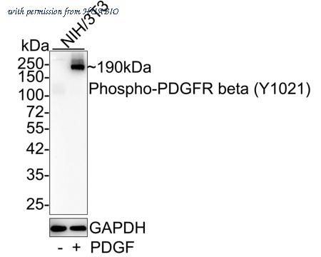 Western blot analysis of Phospho-PDGFR beta (Y1021) on different lysates with Rabbit anti-Phospho-PDGFR beta (Y1021) antibody (HA721833) at 1/1,000 dilution. Lane 1: NIH/3T3 whole cell lysate Lane 2: NIH/3T3 treated with 100 ng/mL PDGF for 5 minutes whole cell lysate Lysates/proteins at 20 µg/Lane. Predicted band size: 124 kDa Observed band size: 190 kDa Exposure time: 1 minute; 4-20% SDS-PAGE gel. Proteins were transferred to a PVDF membrane and blocked with 5% NFDM/TBST for 1 hour at room temperature. The primary antibody (HA721833) at 1/1,000 dilution was used in 5% NFDM/TBST at room temperature for 2 hours. Goat Anti-Rabbit IgG - HRP Secondary Antibody (HA1001) at 1:50,000 dilution was used for 1 hour at room temperature.