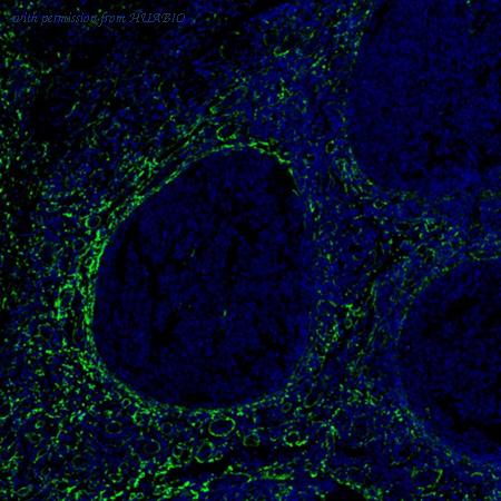 Immunofluorescence analysis of frozen mouse spleen tissue with Rabbit anti-PDGFR beta antibody (ET1605-20) at 1/200 dilution. The section was not undergone antigen retrieval. The tissues were blocked in 10% negative goat serum for 1 hour at room temperature, washed with PBS, and then probed with the primary antibody (ET1605-20, green) at 1/200 dilution overnight at 4 ℃, washed with PBS. Goat Anti-Rabbit IgG H&L (iFluor™ 488, HA1121) was used as the secondary antibody at 1/1,000 dilution. Nuclei were counterstained with DAPI (blue).