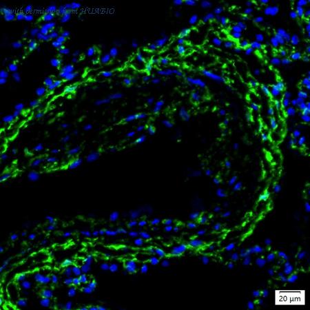 Immunofluorescence analysis of frozen mouse spleen tissue with Rabbit anti-PDGFR beta antibody (HA750082) at 1/200 dilution. The section was not undergone antigen retrieval. The tissues were blocked in 10% negative goat serum for 1 hour at room temperature, washed with PBS, and then probed with the primary antibody (HA750082, green) at 1/200 dilution overnight at 4 ℃, washed with PBS. Goat Anti-Rabbit IgG H&L (iFluor™ 488, HA1121) was used as the secondary antibody at 1/1,000 dilution. Nuclei were counterstained with DAPI (blue).