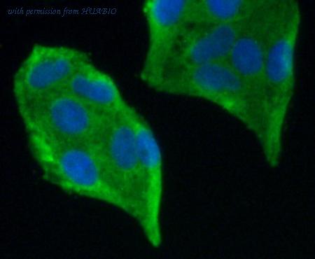 ICC staining PDGF Receptor beta in Hela cells (green). The nuclear counter stain is DAPI (blue). Cells were fixed in paraformaldehyde, permeabilised with 0.25% Triton X100/PBS.